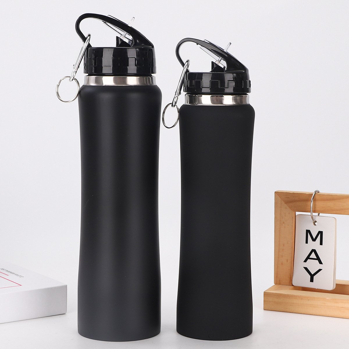 Single wall stainless steel bottleStainless steel sport bottle, equipped with a black cup lid with a climbing buckle, available in three models: 350ml, 500ml, and 600ml, designed to be portable and practical.
