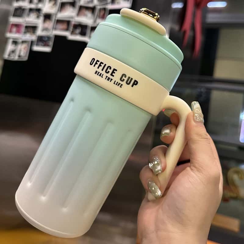 A coffee cup with a handle, with a logo printed on the thermal cup body and a handle design for easy grip. Using a sealed lid, it is suitable for both hot and cold drinks, and is suitable for daily home, office, or outdoor use. It is easy to operate and leak proof, making it a practical daily drinking and coffee container.